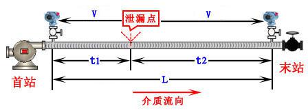 注:管道长度L、声波传波速度V、t1-t2为首末、站次生波接收时间差。