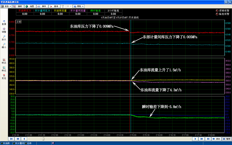2013年1月26日2时14分55秒该管线发生泄漏,系统2时16分10秒发出报警,定位泄漏位置在距东油库1.57公里处,保卫人员迅速出警,驱走盗油分子,缴获盗失原油,使损失降到*低。