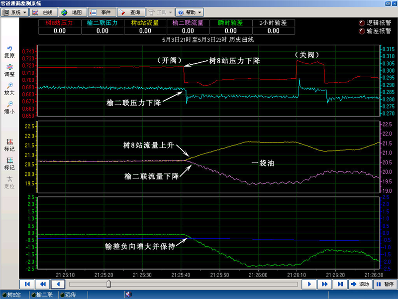 上图可以看出为袋装盗油,每袋容量约为0.06m3 ,5分钟内共开关阀8次。因系统报警及时,定位准确,工作人员快速处理,盗油分子仅放出十几袋油,就被驱散,泄漏原油全部缴回。