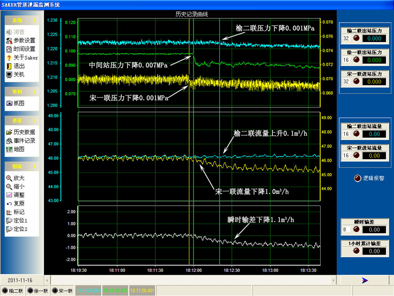 2011年11月16日榆二联-宋一联输油管线发生泄漏,18时11分59秒泄漏开始,系统在18时13分26秒发出报警,泄漏排量约为1.1 m3/h,至21时30分02秒关阀结束。定位在距中间站(徐一联)10.21公里处。