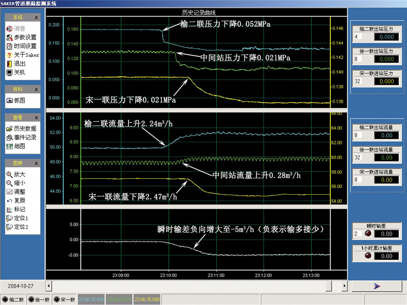 04年10月27日23时10分榆宋输油管线发生泄漏,系统报警。根据各站流量、压力的变化趋势及输差变化,可以判断为典型的管线泄漏,系统及时报警,准确定位。