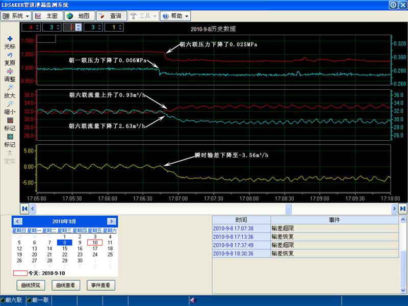 2010年9月8日朝六联-朝一联管线泄漏系统报警曲线