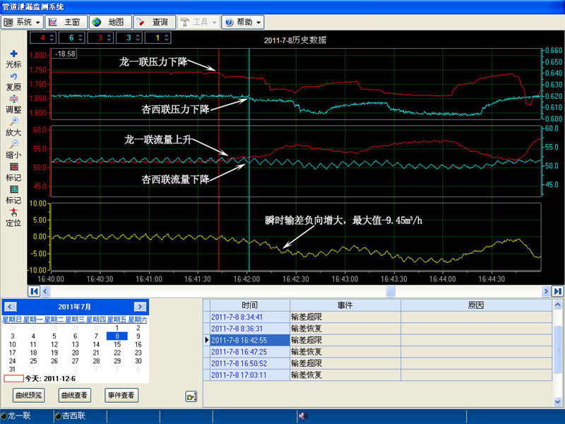 2011年7月8日管线发生泄漏:7月8日16时41分42秒开始**次开阀放油,42分55秒系统发出报警提示,至45分37秒泄漏结束,历时3分55秒,期间有4次动阀门调整泄漏量,泄漏总量约为0.26m3。第二次开阀放油为16时49分23秒开始,50分52秒系统发出报警提示,至17时01分13秒关阀结束,历时11分50秒,期间有3次动阀门调整泄漏量,泄漏总量约为1.39m3。