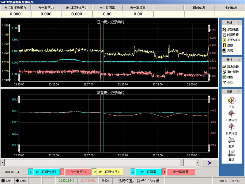 2004年7月24日22时26分58秒系统报警,定位泄漏点据宋二联0.96公里(新线),该次泄漏从22时26分开始至23时04分结束,历时38分,此次为编制袋盗油,共计29袋,盗油排量在2.3-4.3 m3/h,泄漏总量约2.5 m3。系统报警及时、定位准确,被盗原油全部缴回。