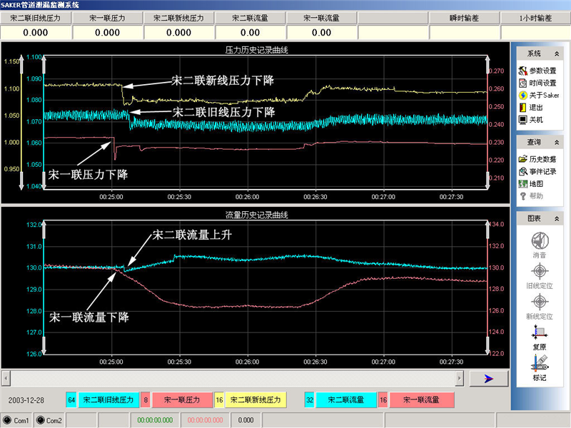 03年12月28日宋二联-宋一联管线泄漏报警曲线图