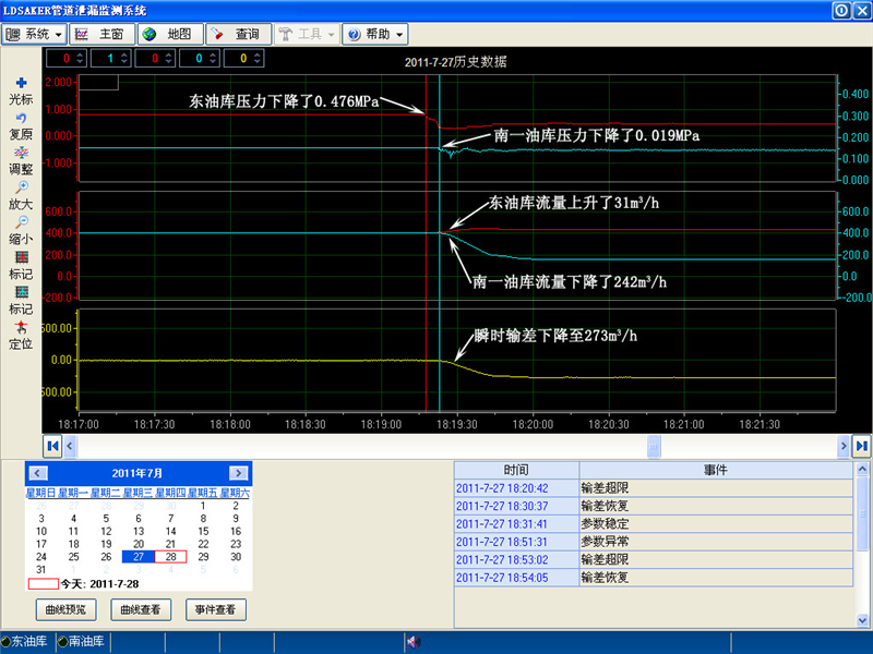 2011年7月27日东油库—南一库输油管线发生泄漏,泄漏发生时间为18时19分17秒,系统在18时20分42秒发出报警,定位泄漏位置在距东油库5.85公里处,值班人员及时确认并同时上报,在18时28分57秒停泵,整个过程共用时9分40秒。后查实该次泄漏为南一路改造施工挖掘机意外挖破管线造成。