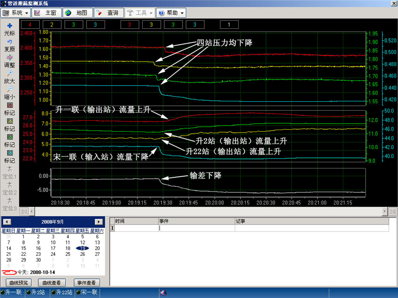 2008年9月19日该管线发生泄漏:20时19分24秒泄漏发生,20分30秒三个输出站的LD-SAKER管道泄漏监测系统同步发出报警,定位在距升一联14.78公里处。