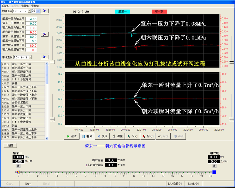 2010年2月2日肇东一联-朝六联输油管线发生泄漏:20时0分28秒泄漏开始,18秒后系统报警,20时1分05秒结束,历时37秒,泄漏排量约为1.2m3/h,泄漏总量约0.013 m3,系统定位泄漏点在距肇东一6.24公里处。该过程应为打孔拔钻瞬间报警图(钻透到拔钻仅37秒钟)。