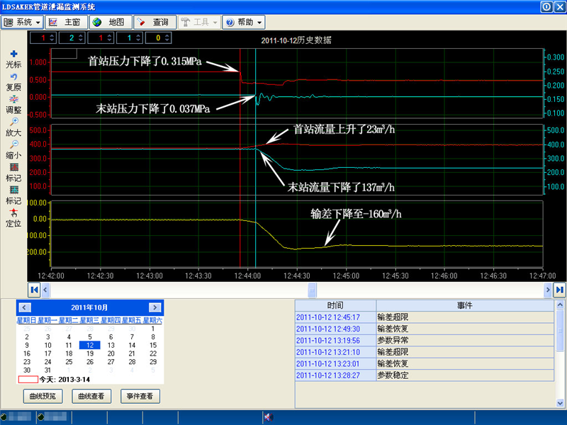大庆油田某采油厂A站-B站输油管线长17.3㎞,管径ф429㎜,日输原油12000m3。 2006年11月安装LD-SAKER管道泄漏监测系统。2011年10月12日12时43分55秒发生泄漏:系统在45分17秒报警,定位泄漏位置在距首站3.67公里处,管理部门处理果断、及时,整个过程仅用时3分53秒,将损失降到了*小。此次泄漏因挖掘机施工造成,平均瞬时泄漏量约160m3/h。